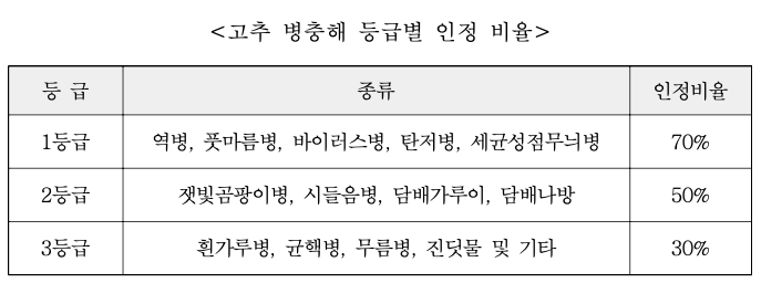 고추 병충해는 등급별 인정 비율이 전부 다르기 때문에