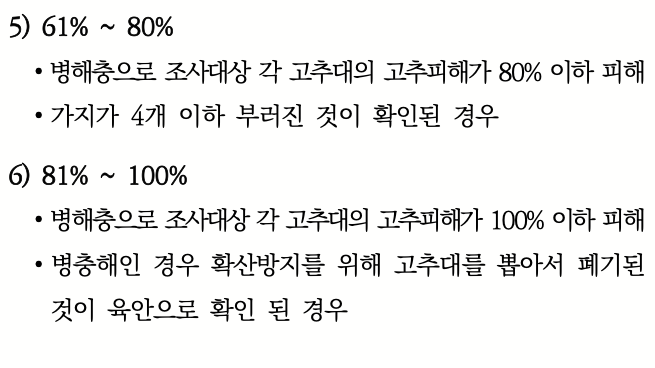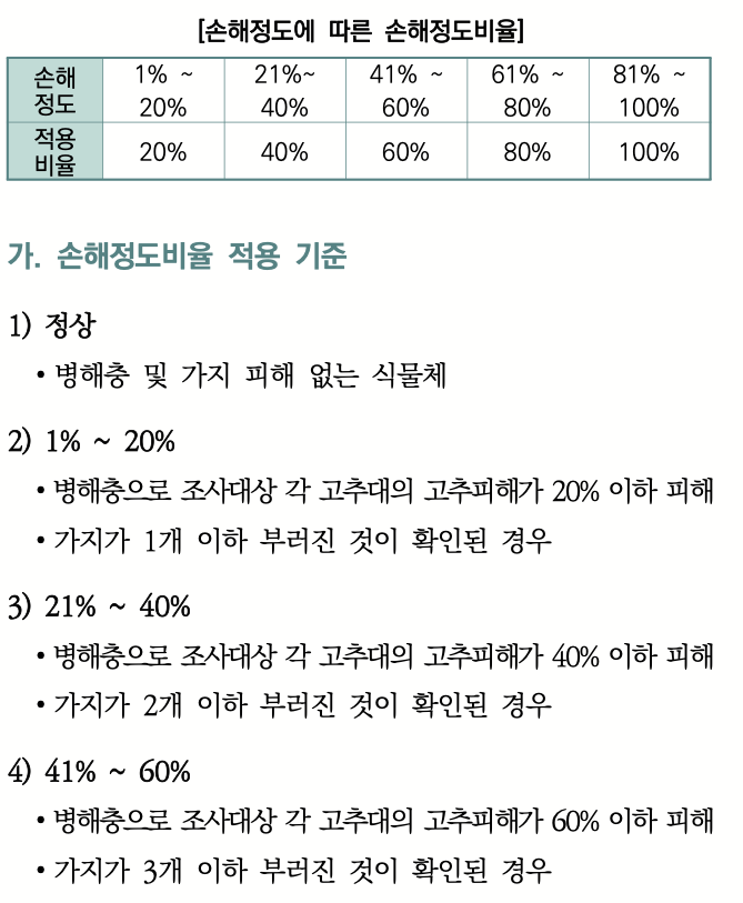 표본 이랑별로 식재된 작물을 손해정도 비율표와 고추 병충해 등급별 인정비율에 따라서 구분하여 조사합니다.