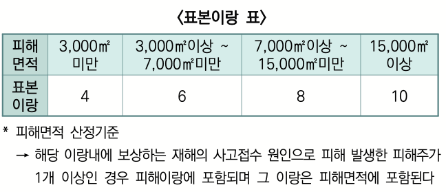피해면적에 따라서 표본이랑 수를 정합니다.