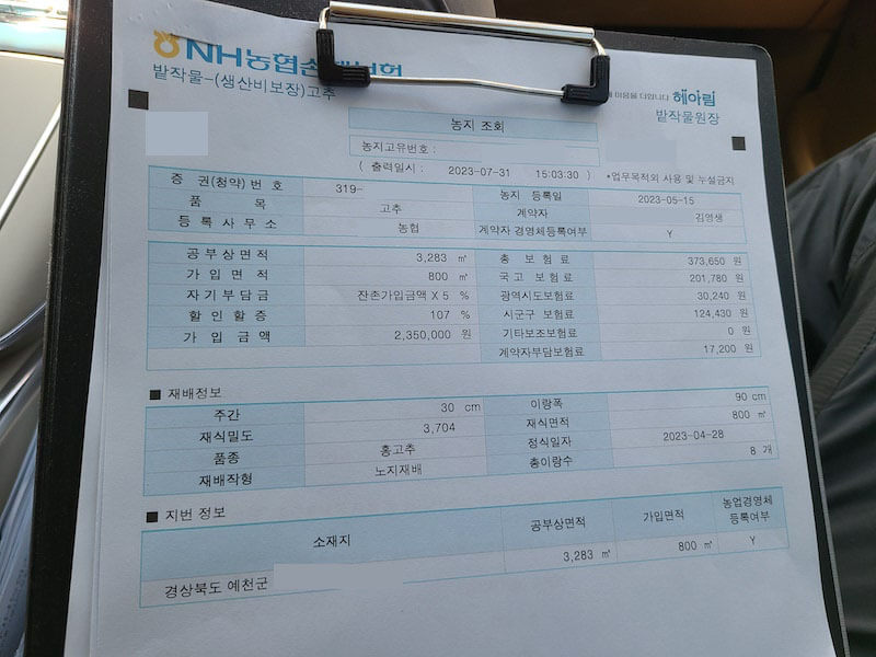 혹시 가입면적과 실제경작면적이 차이가 있으면 계약변경을 해야 합니다.