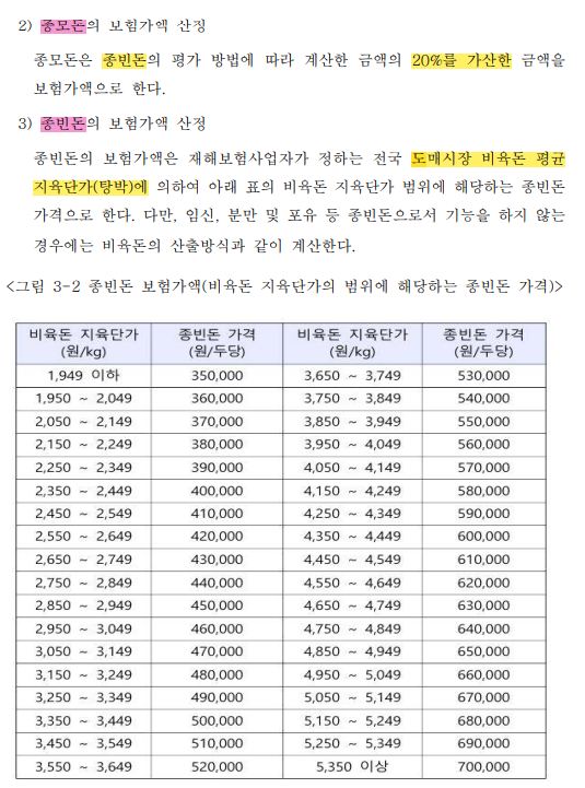 종빈돈, 종모돈 보험가액