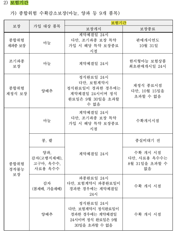 종합위험 수확감소보장(마늘, 양파등 9개품목)