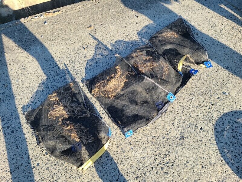 수확한 콩을 각 구간별로 그물망에 넣습니다.