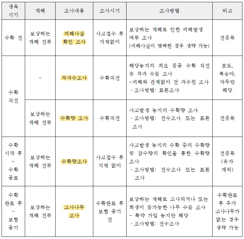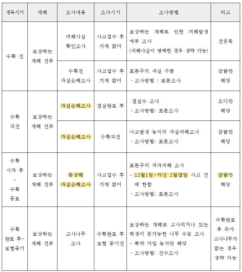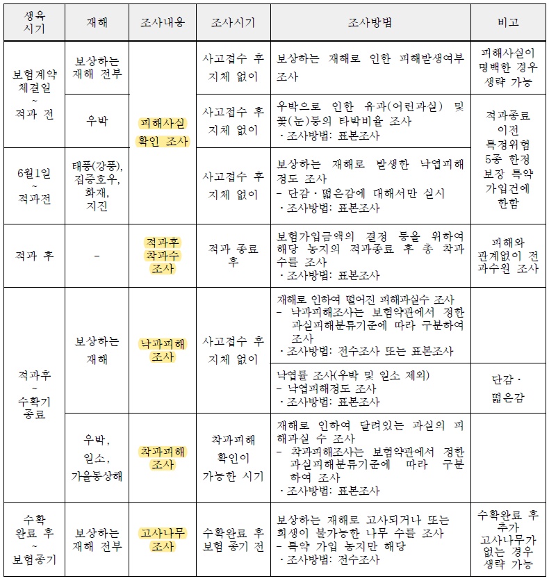 가장 중요한 적과전 종합위험방식은 각시기별로 여러가지 조사를 합니다. 적과전 우박피해로 유과타박율을 조사합니다. 그리고 적과후에는 피해와 관계없이 적과후 착과수 조사를 전 과수원이 조사를 한다는것을 꼭 기억하셔야 합니다. 적과 후에는 낙과피해조사, 착과피해조사를 하고 수확완료후에는 고사나무조사를 합니다. 각시기별로 조사내용들이 전부 다르기때문에 확실하게 기억해야합니다.