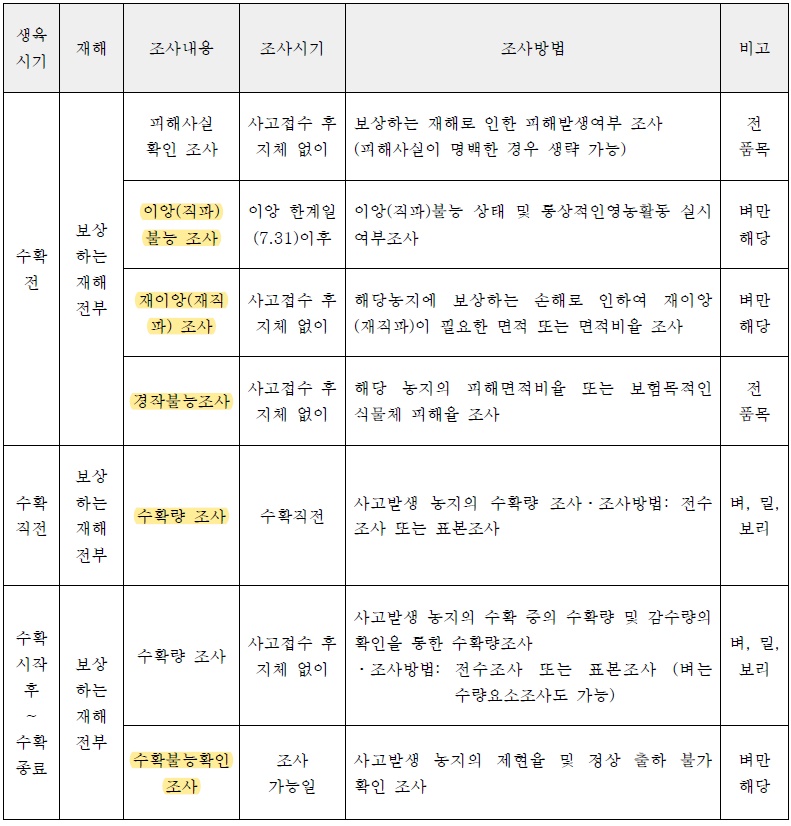벼는 가장많이 작물을 재배하기 때문에 그만큼 조사시기에 따라서 다양한 조사를 합니다. 이앙직파불능조사, 재이앙 재직파 조사, 경작불능조사, 수확량조사, 수확불능확인조사를 합니다. 나머지 밀,보리는 경작불능조사, 수확량조사만합니다.