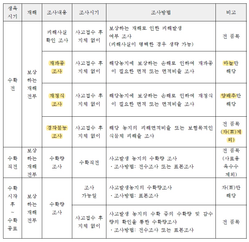 밭장물 종합위험 수확감소보장 조사종류